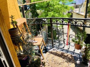 Уютный балкон с кованными перилами для утренних кофе-пауз или вечернего отдыха смотрит на тихую улочку.