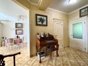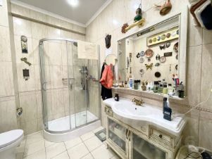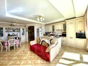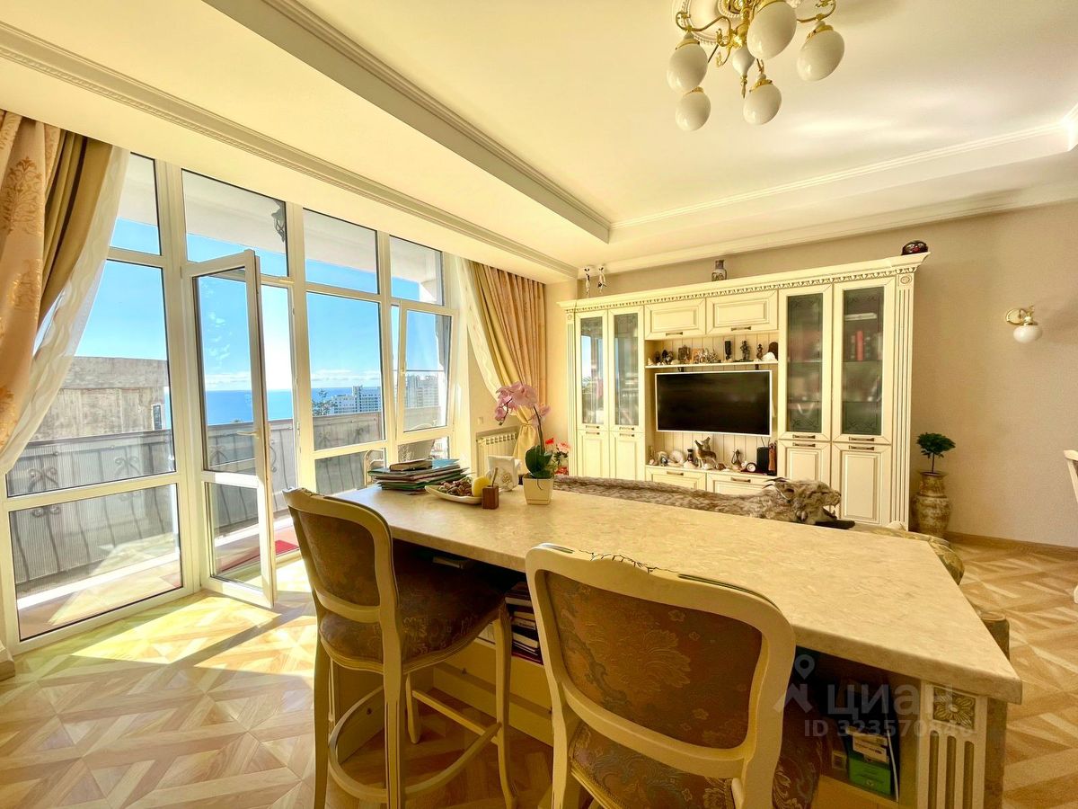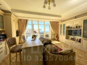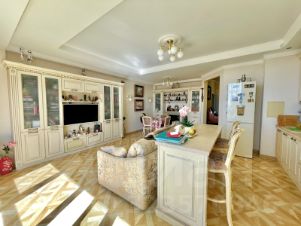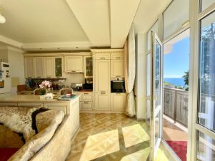 С большой террасой и видом на море. Планировка разлетайка, Одна комната выходит на Юг - солнечная светлая; другая на Север, в летнюю жару всегда в спальне комфортная температура. С обоих комнат выход на террасы. Есть выделенные места для хранения. просторная прихожая с которой так же уже начинается вид на море. Сделан хороший ремонт в классическом стиле. Дорогая встроенная техника Bosh.