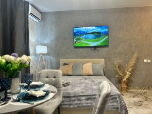 - В квартире также имеется: телевизор со Smаrt-ТV, Wi-Fi, шкаф для одежды, гладильная доска, утюг, кондиционер.