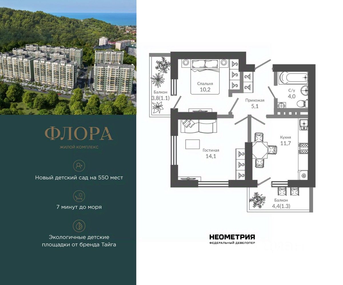 Продается квартира в ЖК "Флора" от федерального девелопера "Неометрия". Это жилой комплекс комфорт-класса в самом зеленом районе Сочи. При проектировании постарались максимально сохранить окружающую флору и фауну. Теплое море, горы, целебные источники, река, близость заповедника все это уже рядом с вами.
