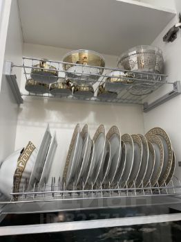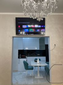 На кухне: встраиваемая мебель и техника, удобный раскладывающийся диван Ascona, стол раскладной ,стулья (2 штуки), холодильник BOSH , посудомойка, индукционная плита на 4 конфорки, вытяжка, духовой шкаф, чайник BORK, также есть вся необходимая посуда (тарелки, столовые приборы, чашки, бокалы для вина, бокалы для шампанского, бокалы для виски, рюмки,стаканы), сплит система