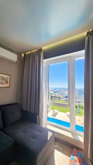 Просторная квартира с панорамными окнами и высокими потолками. Прекрасный вид на Сириус, на закрытой территории бассейн и мангальная зона под крышей.