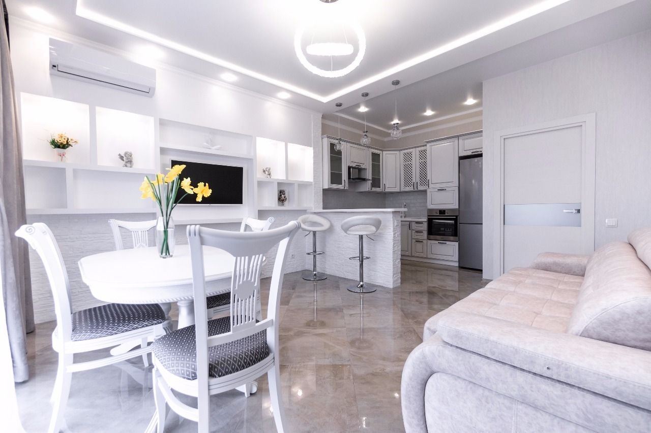 Выполнен дизайнерский ремонт в спокойных тонах с использованием только натуральных материалов, премиальные мебель и техника.