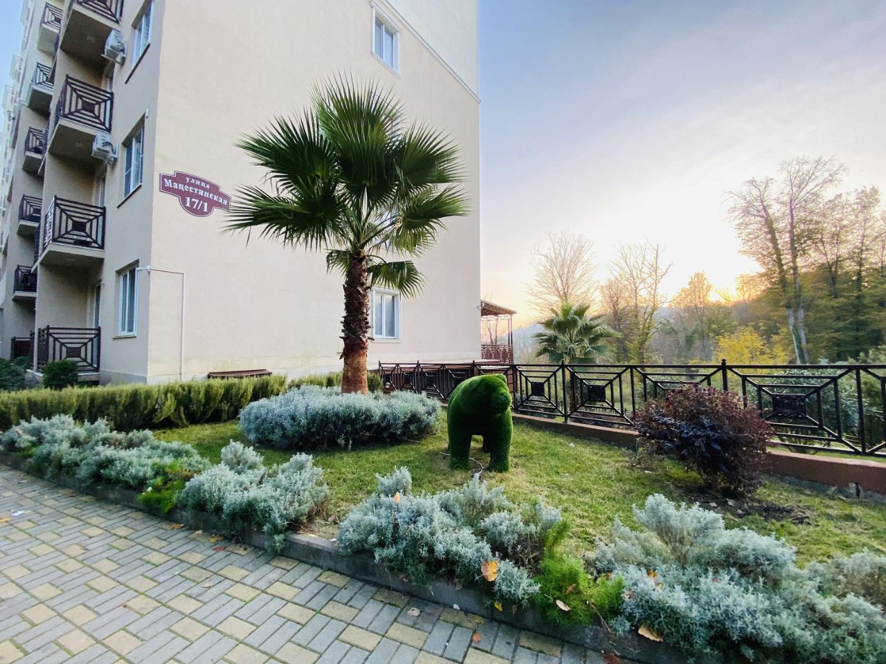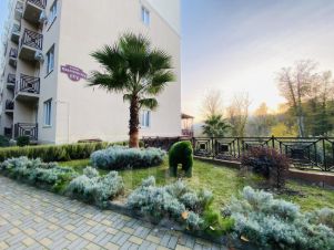 - Вокруг дома выполнено ландшафтный дизайн и озеленение, который сочетается с зелеными хвойными и лиственными растениями, граничащими с комплексом.