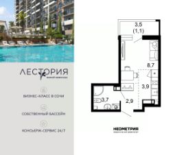 Продается квартира в жилом комплексе бизнес-класса "Лестория". В составе ЖК предусмотрена собственная аквазона площадью 473 квадратных метра с двумя подогреваемыми бассейнами, что соответствуют стандартам бизнес-класса. Аквазона объединяет взрослый и детский бассейны. В welcome-zone к услугам посетителей шезлонги и все необходимые принадлежности. Раздевалки с душевыми комнатами, инфракрасная сауна — здесь все предусмотрено для комфортного отдыха и полного расслабления. Для водного комплекса продуман отдельный вход, оборудованный системой контроля и управления доступом (СКУД). Аквазона только часть уникальной инфраструктуры "Лестории", которая включает в себя также благоустроенную территорию с пятьюдесятью функциональными зонами для прогулок, отдыха и занятий спортом, видовые террасы на крышах для отдыха, работы и встреч с друзьями, а также пространство набережной Кудепсты с шезлонгами и перголами. Жилой комплекс "Лестория" состоит из шести домов высотностью от 15 до 17 этажей, окружённых зеленым массивом национального парка. На придомовой территории для жителей предусмотрены закрытые дворы с круглосуточным видеонаблюдением, активити-центр для детей и подростков, тихие зоны для отдыха и медитации. На крышах домов будут созданы зеленые террасы для наслаждения прекрасными видами на море и горы. В проекте предусмотрены разные варианты отделки квартир под потребности покупателей. Тем, кто хочет воплотить в жизнь собственные интерьерные задумки, подойдут квартиры без ремонта. Для комфортной жизни и отдыха в комплексе будет работать круглосуточный консьерж-сервис уровня 5*, который с легкостью закроет все ежедневные потребности: от заказа продуктов и встречи гостей в аэропорту до выгула и дрессировки питомца. К услугам жителей ЖК "Лестория" — собственная управляющая компания, для инвесторов предоставляются услуги доверительного управления.