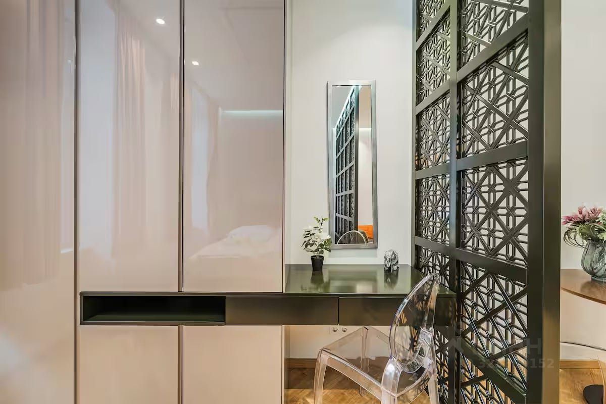 В студии качественный стильный ремонт, мебель сделана на заказ, все остается новым владельцам.