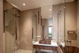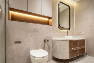 - Санузел: Просторный санузел с отделкой из натурального камня и текстурной плитки. Встроенная мебель с элементами из дерева, подсветка и стильное зеркало создают атмосферу уюта и элегантности.