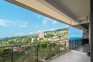 - Кухня-гостиная: Эргономичная кухня с фасадами из крашеного МДФ, встроенной техникой и акцентной отделкой из натурального дерева. Панорамное остекление наполняет пространство светом и открывает вид на город. Уникальная дизайнерская люстра добавляет изысканности интерьеру.