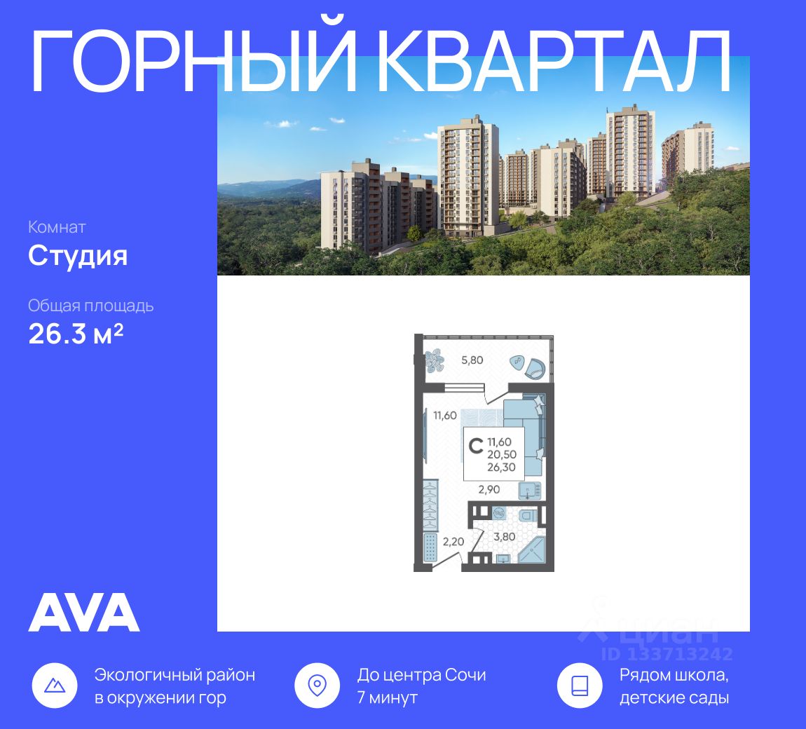 Продается студия в доме (Литер 1), срок сдачи : 3 кв. 2026, общей площадью 26.3 кв.м., на 2 этаже в новом современном жилом комплексе в Сочи "Горный квартал", Хостинский район. Отличный вариант для инвестиций и жизни.
