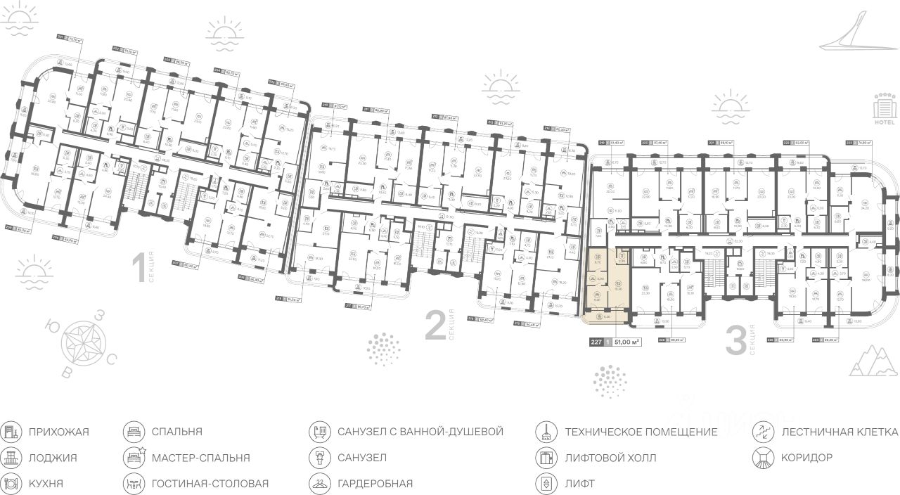 Резиденция с балконом, а также одним санузлом. Из окон открывается вид во внешний двор, на образовательный центр Сириус. Высота потолков составляет 3,1 метра. Отделка под ключ