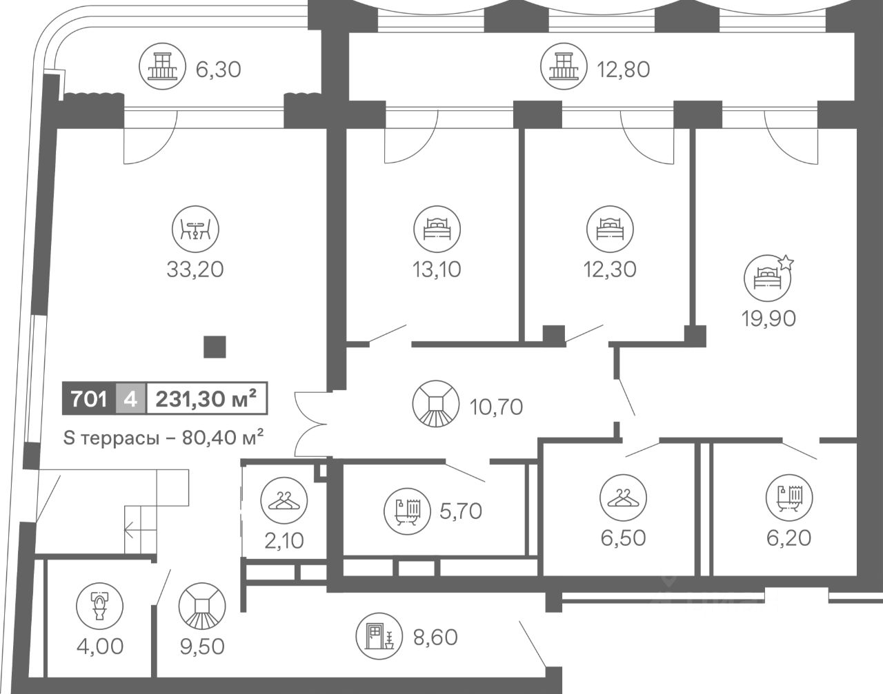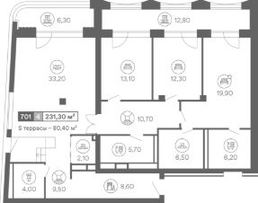 Угловой четырехкомнатный пентхаус с кухнейгостиной и террасой, а также тремя санузлами. Из окон открывается панорамный вид на море. Высота потолков составляет 3,1 метра. Отделка под ключ.