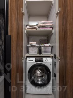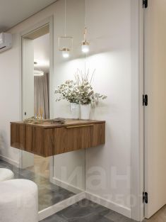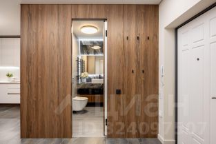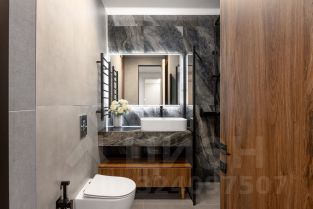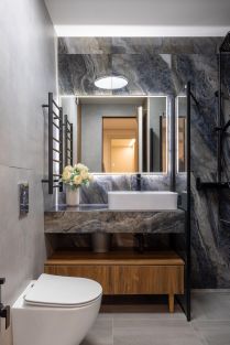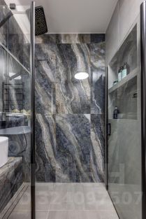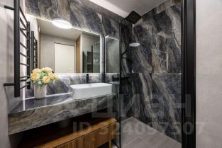 В ванной используются керамогранит крупного формата с выразительным рисунком, что придаёт пространству роскошь и яркий акцент. Установлена большая раковина на столешнице из натурального камня и зеркало с подсветкой. Инсталляция grohe и гигиенический душ. Душевое ограждение с дверью из закаленного стекла, а также душевая система с эффектом тропический дождь. Два встроенных шкафа для хранения, внутри стиральная машина.