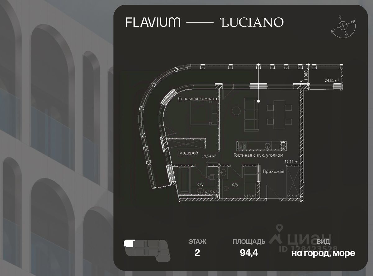 2-комнатные апартаменты располагаются на 6 этаже, а из окон открываются виды на парковую территорию Luciano. Срок сдачи: IV-кв. 2025 Flavium—Luciano — воплощение изысканной архитектуры и гармонии с природой Дом Flavium—Luciano создан для тех, кто ценит утонченную красоту и безупречное качество. Его фасады словно переносят вас в эпоху древнего Рима, где величие соединено с элегантностью. Плавные линии и текстурированные материалы подчеркивают архитектурное мастерство, а панорамные окна раскрывают виды, достойные живописных полотен. Каждая деталь дома продумана до мелочей. Базовая отделка white box позволяет вам воплотить свою мечту об идеальном интерьере. Для тех, кто предпочитает не думать о мелочах, опционально доступна и чистовая отделка. Просторные лоты от 82 до 146 м² дают возможность обрести уютное пространство для жизни. И нет никаких студий только комфортные апартаменты для ценителей высокого уровня жизни. Для вашего удобства предусмотрен вместительный подземный паркинг, оснащённый мойкой, инновационные инженерные системы дома обеспечивают идеальный микроклимат в любое время года, а качественная звукоизоляция позволит наслаждаться морем, местом, природой, не отвлекаясь на постороннее. Жизнь во Flavium—Luciano это не просто пребывание в очередном комплексе. Это среда, формирующая свой комфортный мир вне суеты. Luciano — мир комфорта, который начинается за порогом Инфраструктура Luciano — это воплощение вашей мечты о современном ритме жизни, где все нужное находится в шаговой доступности. Парковая зона и пляж: Представьте утреннюю прогулку среди тенистых деревьев или вечерний отдых у моря. Собственный пляж в 57 минутах ходьбы станет местом, куда захочется возвращаться снова и снова. Гастрономическое путешествие: Четыре ресторана, каждый из которых предлагает уникальный опыт: • "Галерея" с изысканными блюдами европейской кухни. • "Adriana", где средиземноморские шедевры встречаются с паназиатскими акцентами. • "Garden Cafe" с уютной атмосферой сада. • "Посейдон" — панорамный ресторан на побережье, который станет вашим любимым местом для романтических вечеров. Акватермальный и спа-комплекс: Погрузитесь в мир релаксации с хаммамом, русской баней и приватными спа-зонами. А современный фитнес-клуб и медицинский центр помогут вам заботиться о здоровье и поддерживать отличную форму. Семейный комфорт: Детский клуб Luciano Kids создан для гармоничного развития вашего ребенка. Это место, где малыши познают мир через творчество, а родители могут расслабиться, зная, что их дети в надежных руках. Luciano — это не просто инфраструктура, это образ жизни, который подчёркивает статус и окружает заботой. Flavium—Luciano ждет вас, чтобы стать вашим домом, вашим миром и вашей историей.