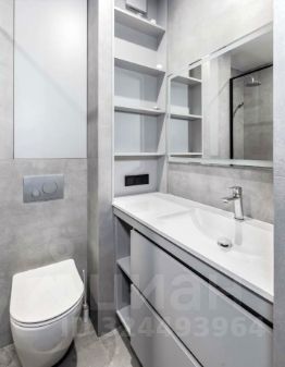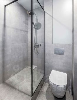 Санузел совмещенный, оформлен в стиле европейского минимализма. Стены - крупный формат плитки под бетон, встроенные ниши и шкафы создают идеальную систему хранения. Подвесная сантехника, душевая без поддона с чёрным алюминиевым профилем - выбор, свойственный дизайнерским проектам класса комфорт+. Матовая плитка по полу и стенам делает пространство визуально чистым и очень современным.