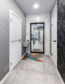 В коридоре нет визуального шума: только комбинации фактур, мраморная облицовка у двери, большое зеркало на двери и подвесная консоль для мелочей. Керамогранит на полу в едином стиле с кухней, создаёт цельность и одновременно подчёркивает премиальность отделки.