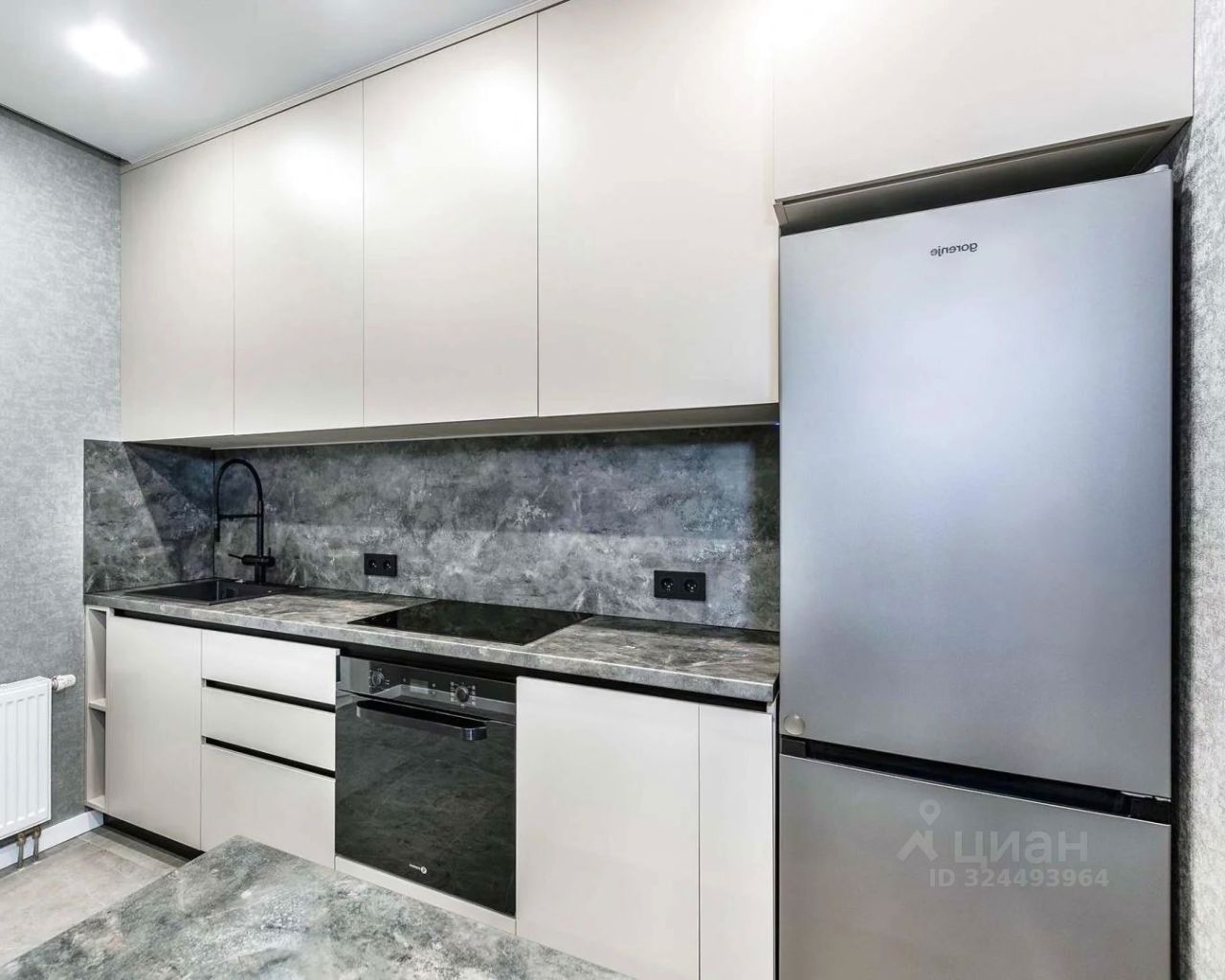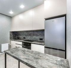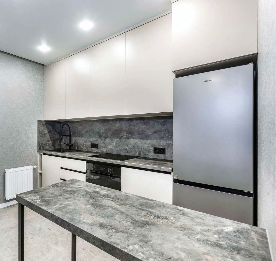 На кухне установлен современный гарнитур. Матовые фасады в спокойных оттенках, рабочая зона под фактуру бетона, встроенная техника, чёрная графичная фурнитура - кухня выглядит как интерьер из актуального европейского каталога. Пол выполнен из крупного керамогранита, который выдерживает любые нагрузки, не боится влаги и годами сохраняет внешний вид. Стоит фильтр для воды и измельчитель - редкое, но крайне удобное решение, упрощающее быт.