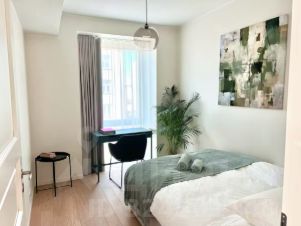 Квартира была отремонтирована в 2024 году и расположена в тихом месте. В квартире большие окна, балкон, светлые и со вкусом меблированные номера со всеми удобствами. В квартире две комнаты - главная спальня с затемняющими шторами, вторая спальня с офисом и гостиная с полностью оборудованной кухней. В спальне расположены атласные простыни премиум-класса, пуховые одеяла и подушки. Кухня оборудована. В квартире есть бесплатный Wi-Fi и большое кабельное телевидение.