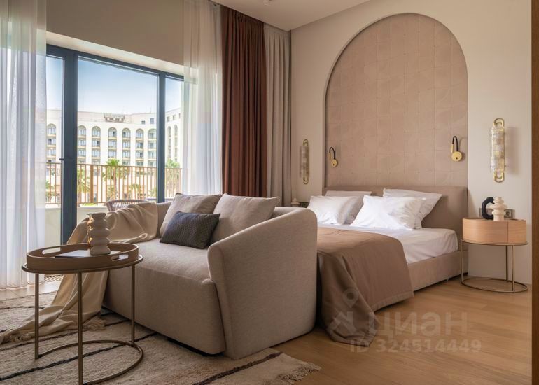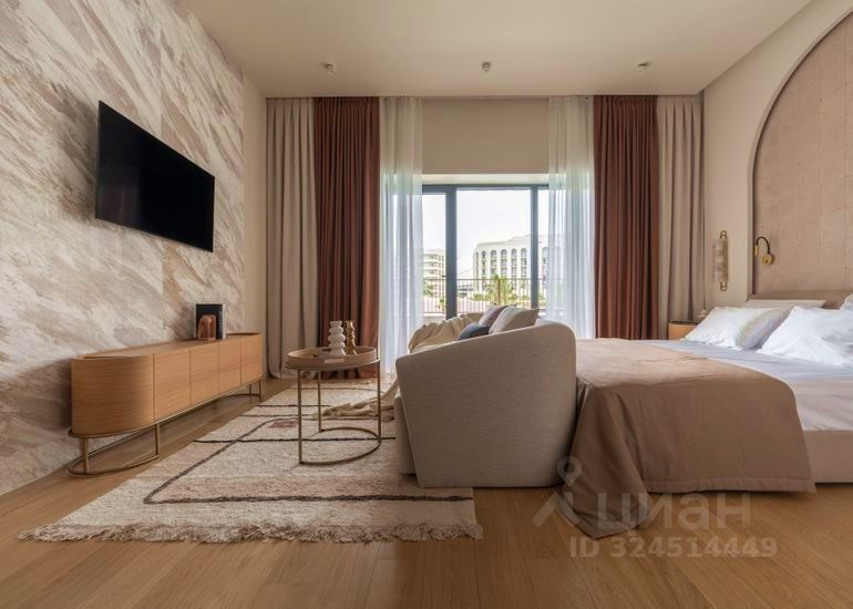 Здесь преобладают насыщенные терракотовые и золотисто-медовые оттенки, которые создают ощущение уюта, тепла и благородства. Расположенный на втором этаже престижного комплекса Mantera Residence, апартамент дарит своим гостям неповторимый вид на бассейны и бескрайнее море, наполняя пространство атмосферой уюта и роскоши.