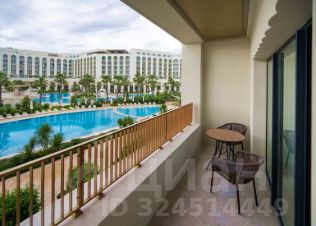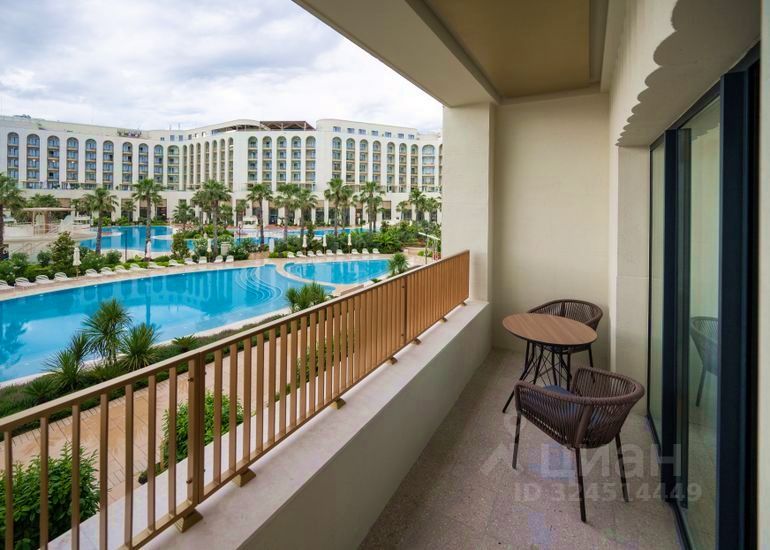 Открытый балкон с зоной отдыха и роскошным видом на бассейны и море