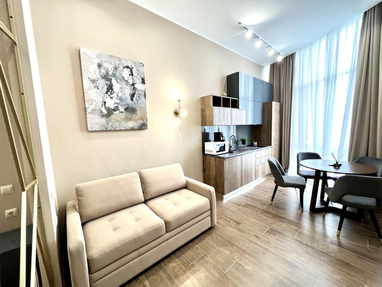 Продам стильные апартаменты в самом сердце Сириуса, Общая площадь составляет 38 кв. м, из которых 17 кв. м занимает уютная гостиная, объединенная с кухней, что создает просторное и светлое пространство для жизни и отдыха. Апартаменты расположены на втором этаже трехэтажного дома. Из окон открывается вид на улицу, а также имеется удобный балкон.