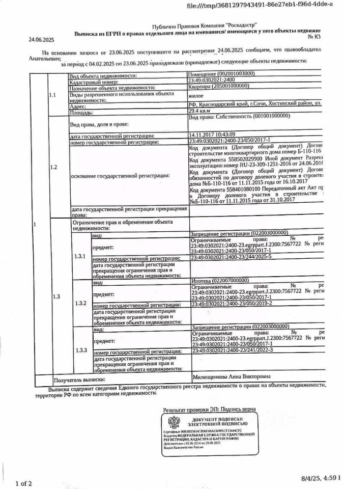 Д-к: Селиверстов К.А. Квартира, площадь 29,4 кв.м., кадастровый номер 23:49:0302021:2400. Адрес: Краснодарский край, г. Сочи, ул. Бытха, д. 8/9, кв. 104. Начальная цена 8 262 999,20 руб., задаток 8 263 руб., шаг аукциона 82 630 руб., ув. 1665