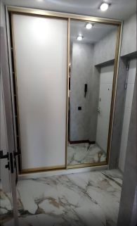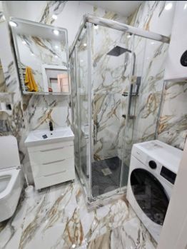 -Освещение: современная люстра с хрустальными элементами и точечные светильники создают уютную атмосферу. Есть настенный светильник для дополнительного освещения.