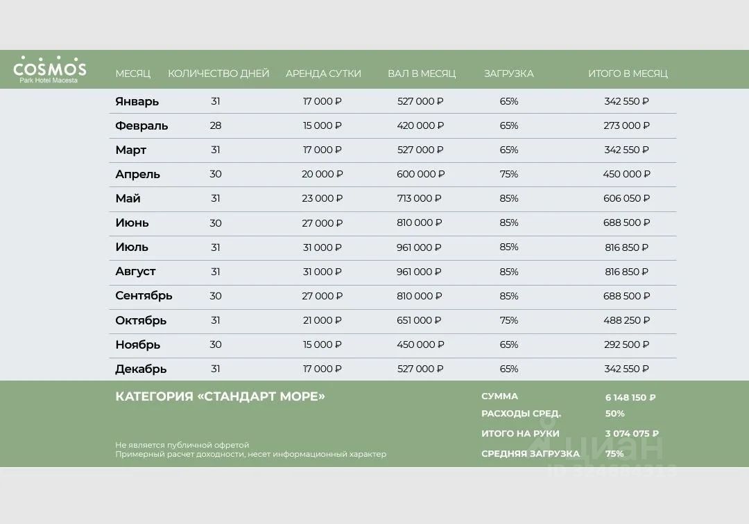 Расчёт доходности для номеров категории Стандарт и Стандарт на море см в фото.