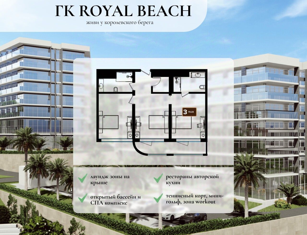ROYAL BEACH SOCHI для жизни или инвестиций. В комплексе доступны резиденции для постоянного проживания или номера в отеле 5* под управлением международного оператора, площадью от 52 до 148 кв метров. ROYAL BEACH SOCHI расположен на впечатляющей территории 10 Гектаров, где имеется вся необходимая инфраструктура. Для отдыха: Масштабная SPA-зоны Лаунж-зоны на крыше Каток Музей винного дела Компьютерный клуб Концертный театр Кинотеатр Рестораны авторской кухни Кафе и кондитерские Музей арт-обьектов Залы для боулинга Бильярдные Спорт и оздоровление: Теннисные корты Поля для мини-гольфа Work out площадка Терренкур Открытый бассейн Спорткомплекс Медицинский центр Для детей: Веревочный парк Батутный комплекс Тематический парк Игровые зоны Детский центр для проведения мастер-классов Деловая среда: Коворкинг-зона Выставочный конгресс - центр Конгресс-холл для совещаний