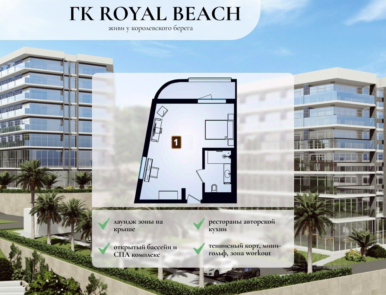 ROYAL BEACH SOCHI для жизни или инвестиций. В комплексе доступны резиденции для постоянного проживания или номера в отеле 5* под управлением международного оператора, площадью от 52 до 148 кв метров. ROYAL BEACH SOCHI расположен на впечатляющей территории 10 Гектаров, где имеется вся необходимая инфраструктура. Для отдыха: Масштабная SPA-зоны Лаунж-зоны на крыше Каток Музей винного дела Компьютерный клуб Концертный театр Кинотеатр Рестораны авторской кухни Кафе и кондитерские Музей арт-обьектов Залы для боулинга Бильярдные Спорт и оздоровление: Теннисные корты Поля для мини-гольфа Work out площадка Терренкур Открытый бассейн Спорткомплекс Медицинский центр Для детей: Веревочный парк Батутный комплекс Тематический парк Игровые зоны Детский центр для проведения мастер-классов Деловая среда: Коворкинг-зона Выставочный конгресс - центр Конгресс-холл для совещаний