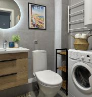 Сан узел совмещенный, в нем расположена ванна, раковина, унитаз и стиральная машина.