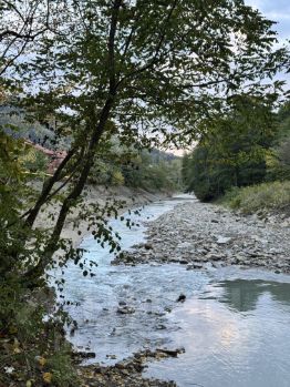 Дом расположен в живописном месте, район отличается чистым воздухом и курортной атмосферой, при этом на транспорте удобно добираться до Сочи и Мацесты. До ближайшего пляжа — 15-20 минут на машине и 30-40 минут на общественном транспорте.