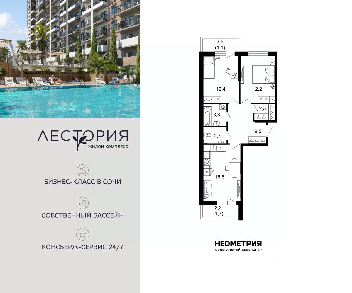 Продается квартира в жилом комплексе бизнес-класса "Лестория". В составе ЖК предусмотрена собственная аквазона площадью 473 квадратных метра с двумя подогреваемыми бассейнами, что соответствуют стандартам бизнес-класса.