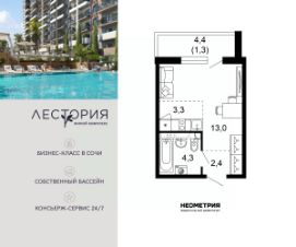 Продается квартира в жилом комплексе бизнес-класса "Лестория". В составе ЖК предусмотрена собственная аквазона площадью 473 квадратных метра с двумя подогреваемыми бассейнами, что соответствуют стандартам бизнес-класса.