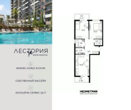 Продается квартира в жилом комплексе бизнес-класса "Лестория". В составе ЖК предусмотрена собственная аквазона площадью 473 квадратных метра с двумя подогреваемыми бассейнами, что соответствуют стандартам бизнес-класса.