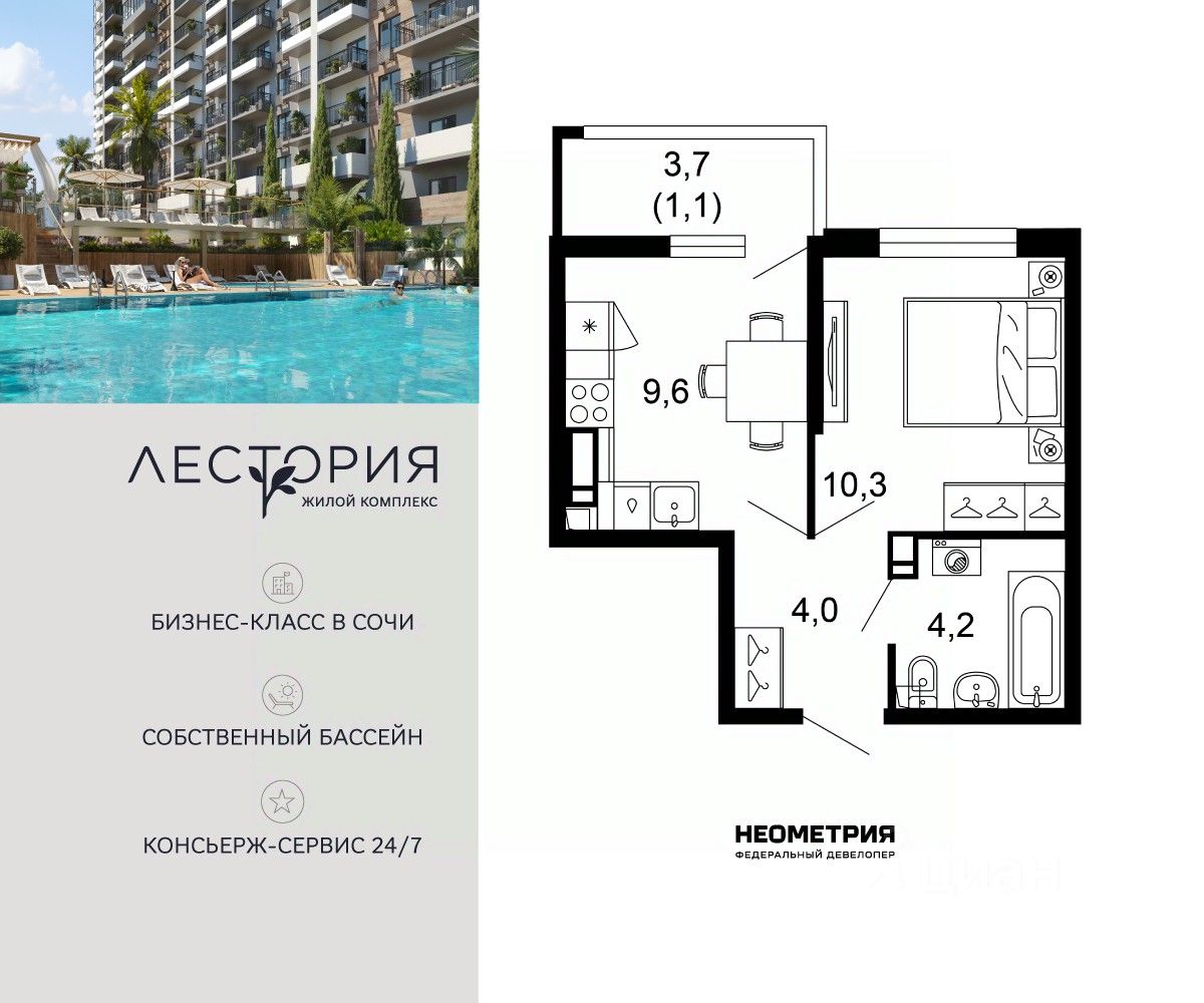 Продается квартира в жилом комплексе бизнес-класса "Лестория". В составе ЖК предусмотрена собственная аквазона площадью 473 квадратных метра с двумя подогреваемыми бассейнами, что соответствуют стандартам бизнес-класса.