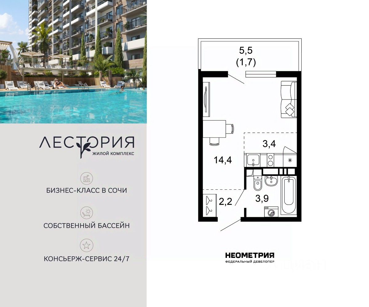Продается квартира в жилом комплексе бизнес-класса "Лестория". В составе ЖК предусмотрена собственная аквазона площадью 473 квадратных метра с двумя подогреваемыми бассейнами, что соответствуют стандартам бизнес-класса.