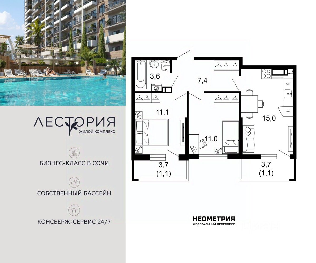 Продается квартира в жилом комплексе бизнес-класса "Лестория". В составе ЖК предусмотрена собственная аквазона площадью 473 квадратных метра с двумя подогреваемыми бассейнами, что соответствуют стандартам бизнес-класса.