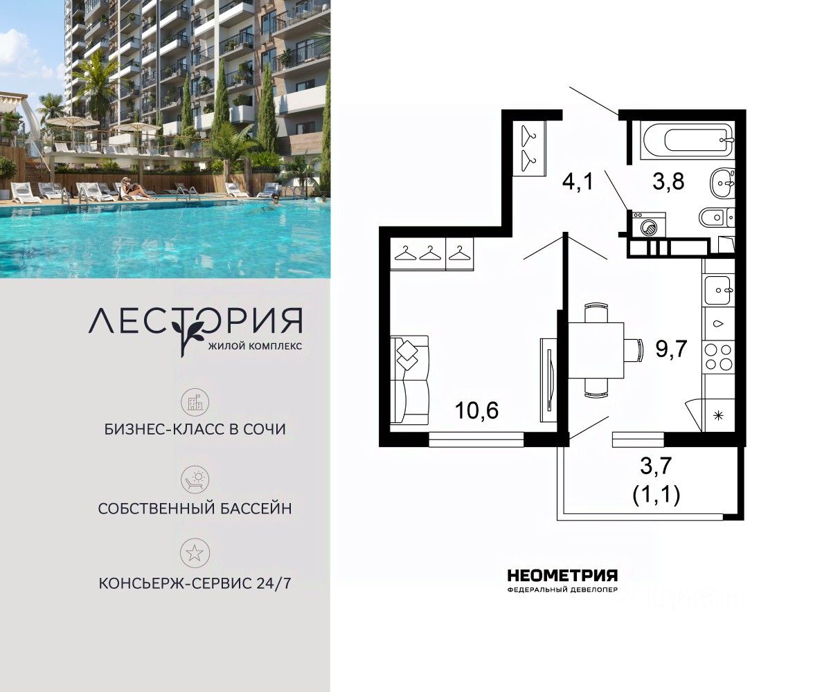 Продается квартира в жилом комплексе бизнес-класса "Лестория". В составе ЖК предусмотрена собственная аквазона площадью 473 квадратных метра с двумя подогреваемыми бассейнами, что соответствуют стандартам бизнес-класса.