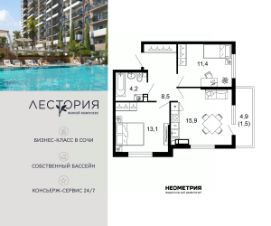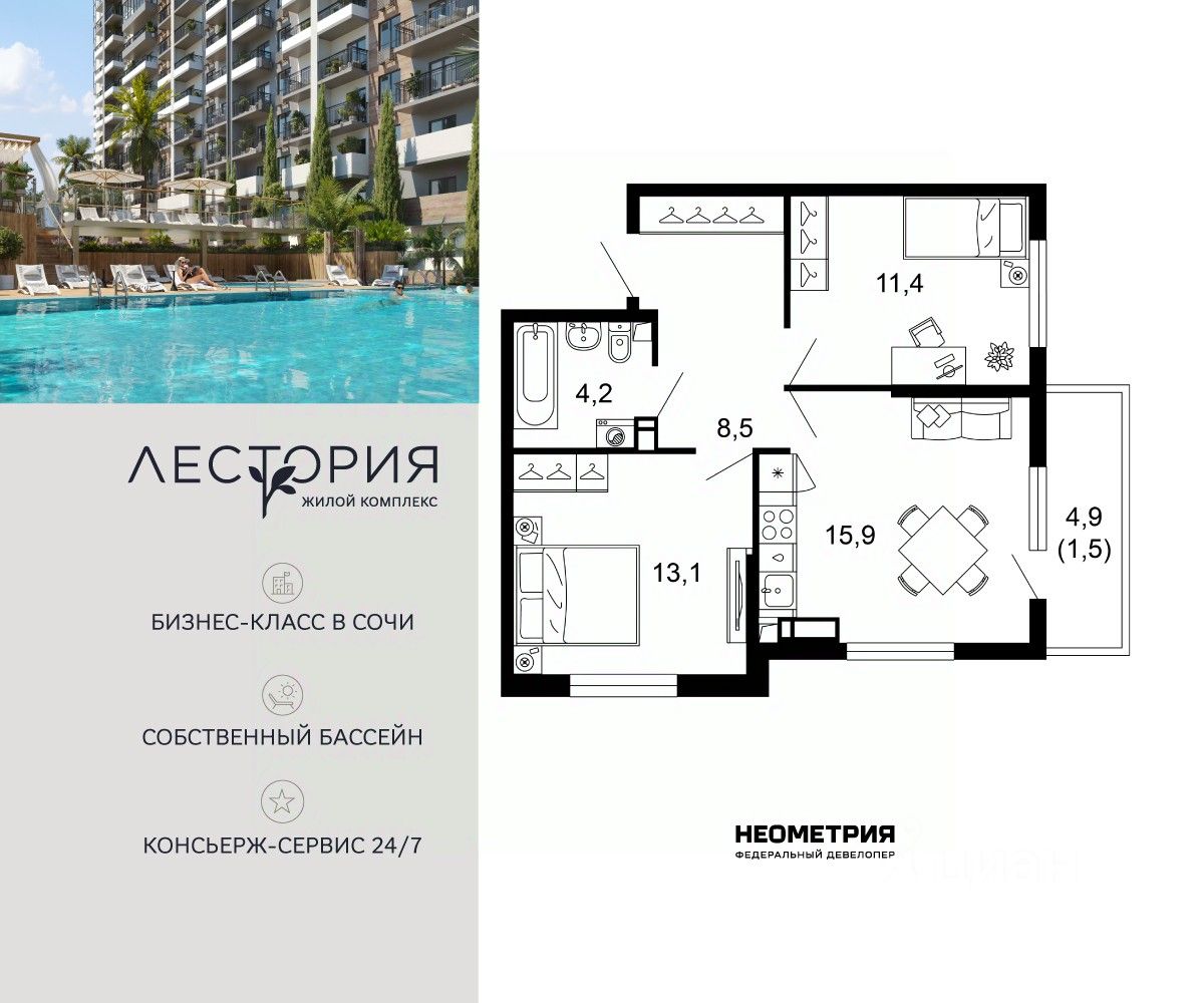 Продается квартира в жилом комплексе бизнес-класса "Лестория". В составе ЖК предусмотрена собственная аквазона площадью 473 квадратных метра с двумя подогреваемыми бассейнами, что соответствуют стандартам бизнес-класса.