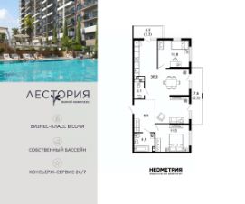 Продается квартира в жилом комплексе бизнес-класса "Лестория". В составе ЖК предусмотрена собственная аквазона площадью 473 квадратных метра с двумя подогреваемыми бассейнами, что соответствуют стандартам бизнес-класса.