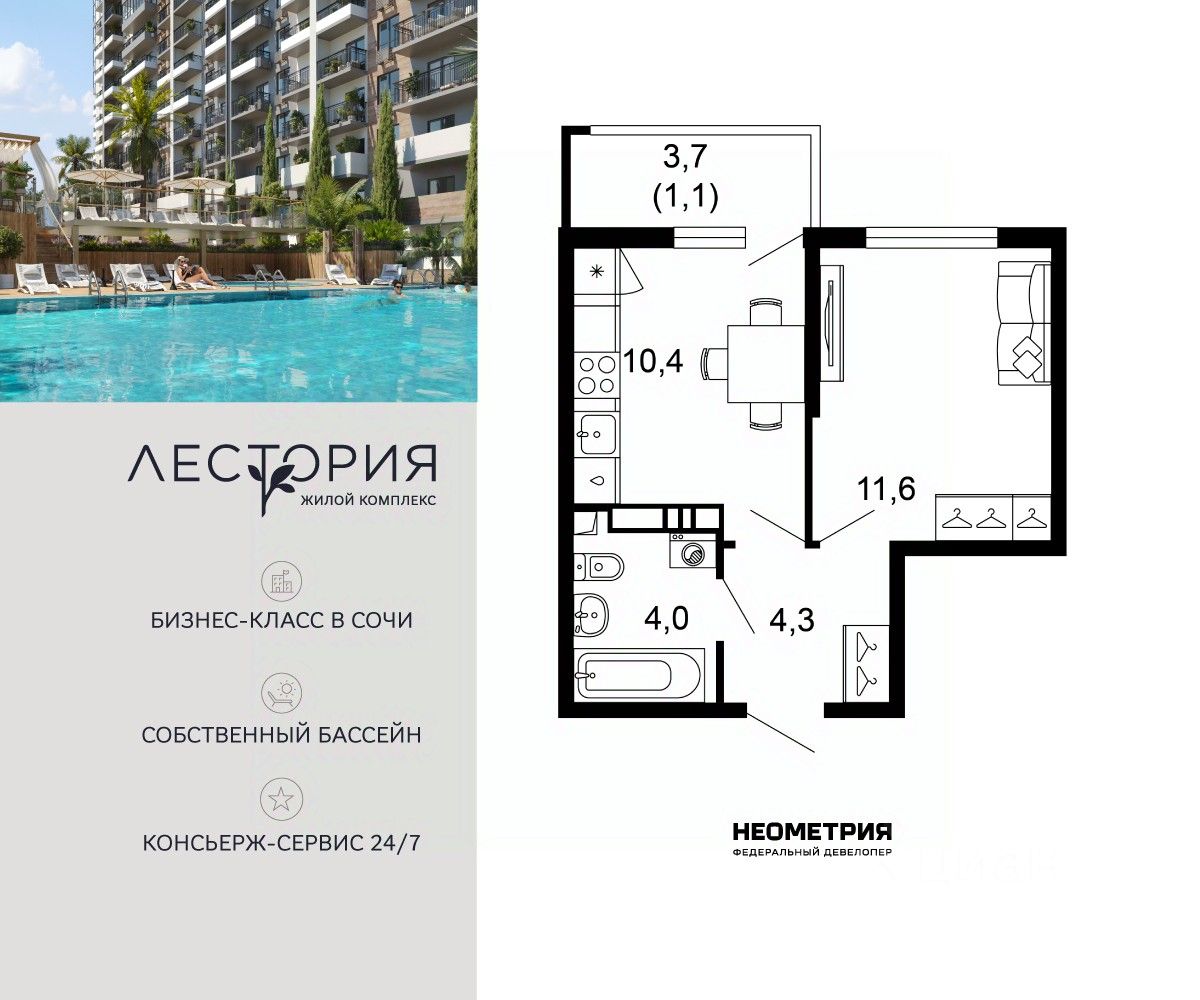 Продается квартира в жилом комплексе бизнес-класса "Лестория". В составе ЖК предусмотрена собственная аквазона площадью 473 квадратных метра с двумя подогреваемыми бассейнами, что соответствуют стандартам бизнес-класса.