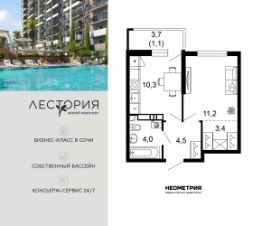 Продается квартира в жилом комплексе бизнес-класса "Лестория". В составе ЖК предусмотрена собственная аквазона площадью 473 квадратных метра с двумя подогреваемыми бассейнами, что соответствуют стандартам бизнес-класса.