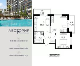Продается квартира в жилом комплексе бизнес-класса "Лестория". В составе ЖК предусмотрена собственная аквазона площадью 473 квадратных метра с двумя подогреваемыми бассейнами, что соответствуют стандартам бизнес-класса.