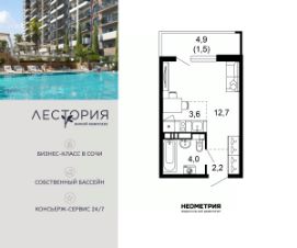 Продается квартира в жилом комплексе бизнес-класса "Лестория". В составе ЖК предусмотрена собственная аквазона площадью 473 квадратных метра с двумя подогреваемыми бассейнами, что соответствуют стандартам бизнес-класса.