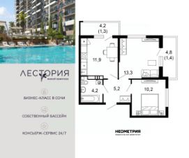 Продается квартира в жилом комплексе бизнес-класса "Лестория". В составе ЖК предусмотрена собственная аквазона площадью 473 квадратных метра с двумя подогреваемыми бассейнами, что соответствуют стандартам бизнес-класса.