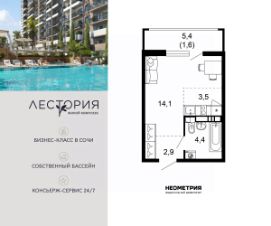 Продается квартира в жилом комплексе бизнес-класса "Лестория". В составе ЖК предусмотрена собственная аквазона площадью 473 квадратных метра с двумя подогреваемыми бассейнами, что соответствуют стандартам бизнес-класса.