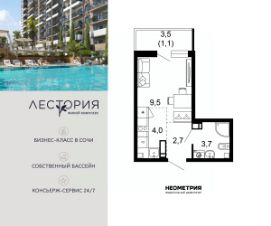 Продается квартира в жилом комплексе бизнес-класса "Лестория". В составе ЖК предусмотрена собственная аквазона площадью 473 квадратных метра с двумя подогреваемыми бассейнами, что соответствуют стандартам бизнес-класса.