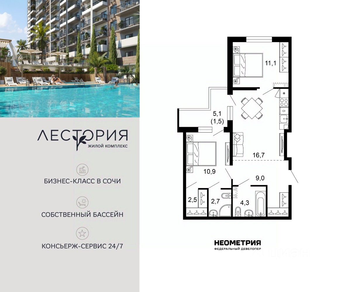 Продается квартира в жилом комплексе бизнес-класса "Лестория". В составе ЖК предусмотрена собственная аквазона площадью 473 квадратных метра с двумя подогреваемыми бассейнами, что соответствуют стандартам бизнес-класса.