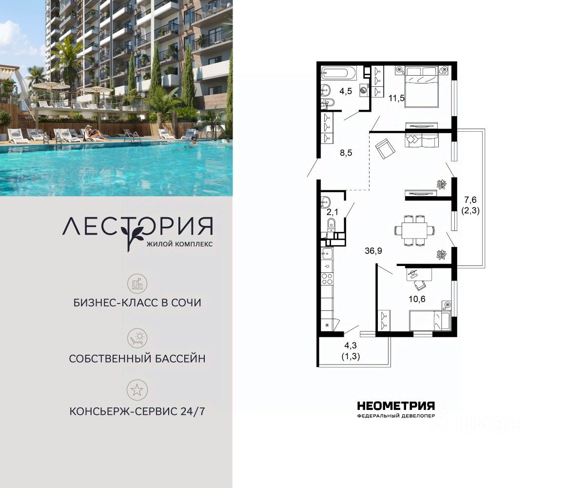 Продается квартира в жилом комплексе бизнес-класса "Лестория". В составе ЖК предусмотрена собственная аквазона площадью 473 квадратных метра с двумя подогреваемыми бассейнами, что соответствуют стандартам бизнес-класса.