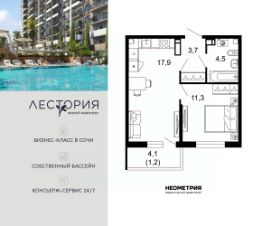 Продается квартира в жилом комплексе бизнес-класса "Лестория". В составе ЖК предусмотрена собственная аквазона площадью 473 квадратных метра с двумя подогреваемыми бассейнами, что соответствуют стандартам бизнес-класса.